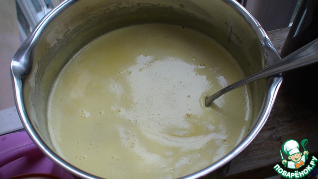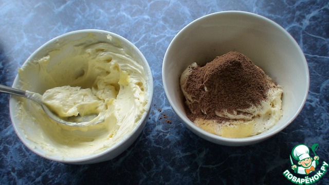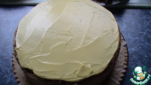 Когда крем готов, влить коньяк. Взбить. На этой стадии я отложила немного крема для покрытия верха торта (5-7 ст. л.)