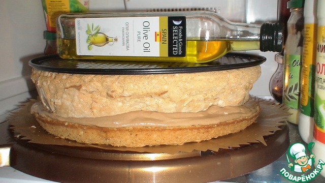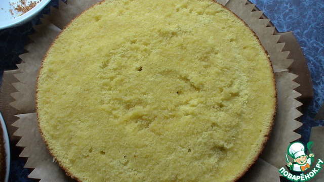 Собираем торт. Бисквит разрезать на две части, обе пропитать сиропом.