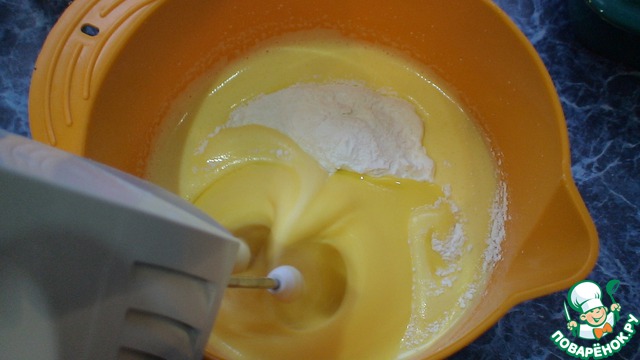 Просеять в миску муку, крахмал и разрыхлитель. Постепенно подсыпать в яичную смесь и вымешивать.