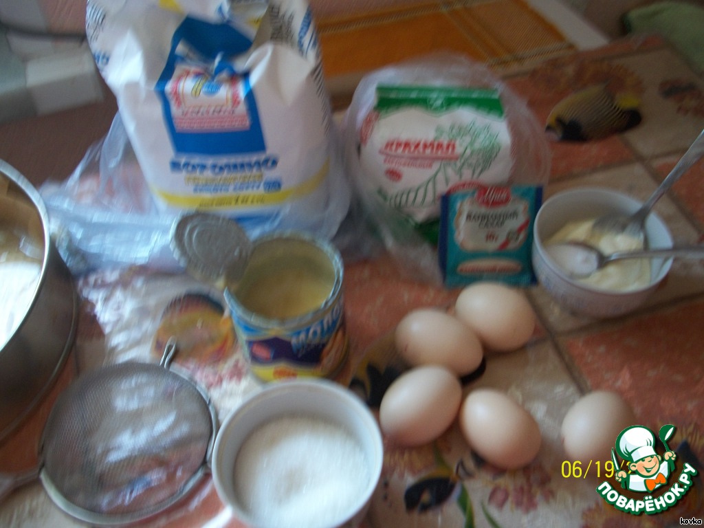 Взбить желтки со сгущёнкой, сметаной. Смешать со смесью муки и крахмала (предварительно просеяв).