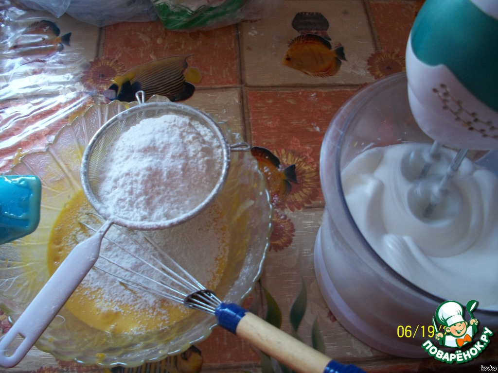 Отделить белки от желтков. Белки взбить в крепкую пену с сахаром.