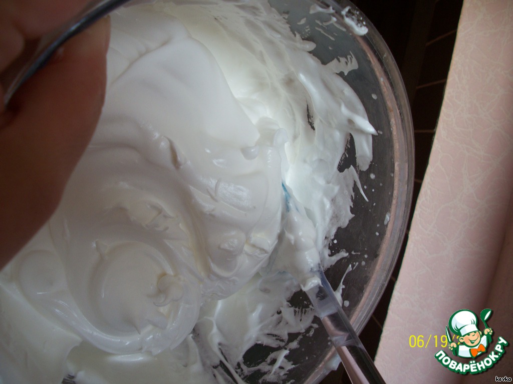 Охлаждённые белки взбить в крепкую пену. В три-четыре приёма ввести сахар и взбивать на максимальной скорости до состояния "нетечения".
