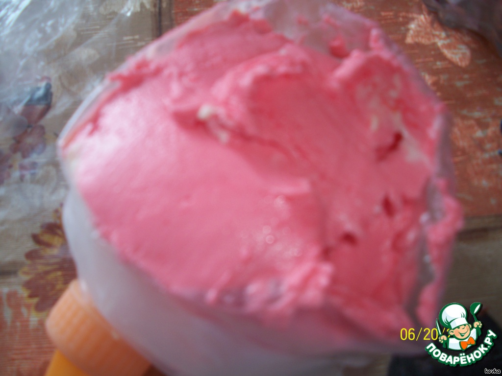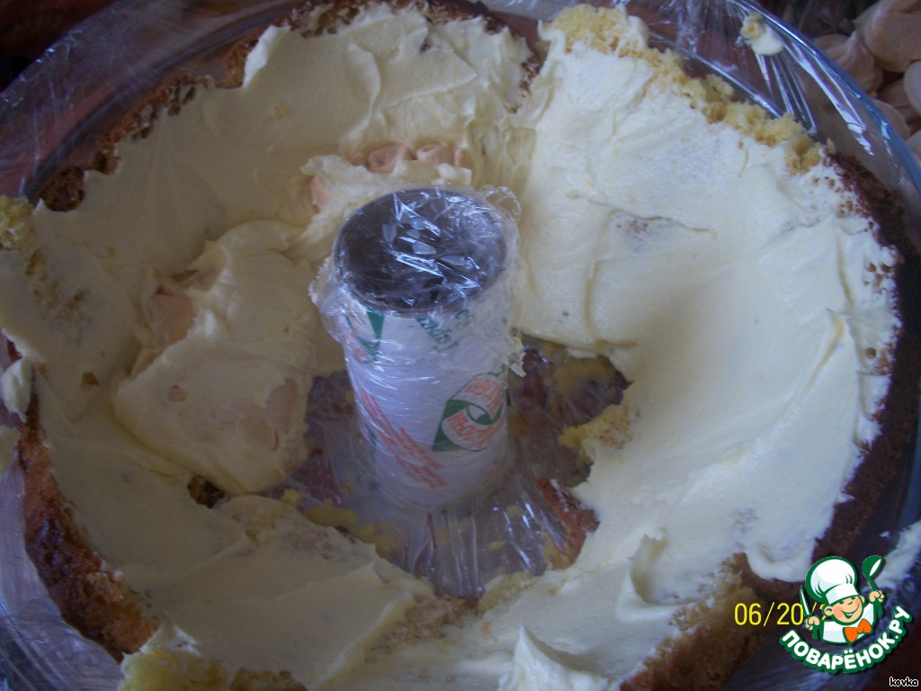 Перевернуть на поднос, на котором будет находиться ваш торт. Снять миску и пищевую плёнку.