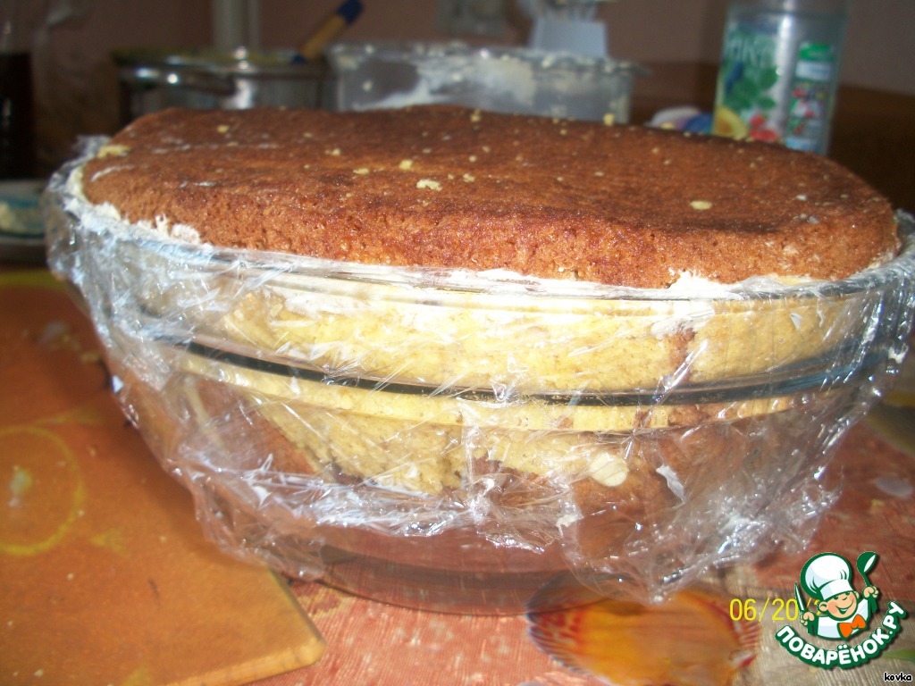 Бисквит разрезать на 3 части. 2 части нарезать на куски и выложить стенки подготовленной миски. Бисквит пропитать и намазать кремом. Для пропитки оставить 0,5 стакана молочного сиропа и смешать с коньяком.