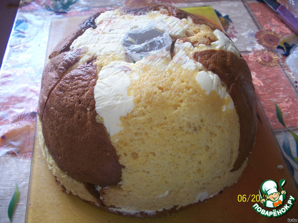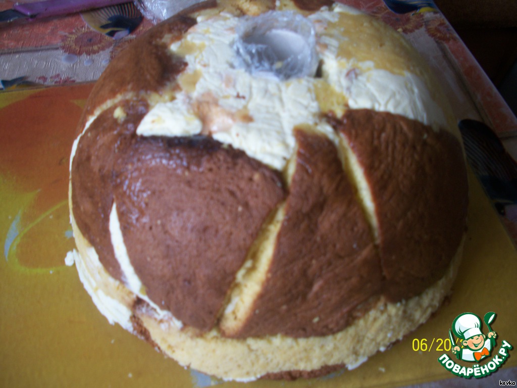 Оставшуюся 1/3 бисквита пропитать, намазать кремом и накрыть сверху всю конструкцию.