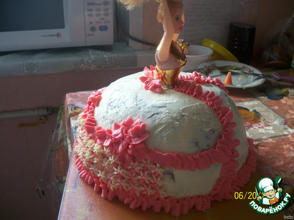 Куклу я подготовила заранее. Сняла платье, бюст обмотала бумажной лентой, упаковала в пищевую плёнку. Вставила в трубку по центру торта. Обмазала тонким слоем крема.
