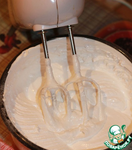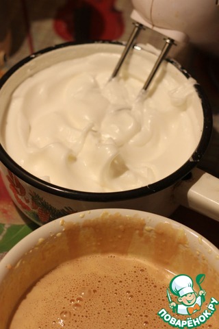 Пять белков взбейте со 100 г сахара до устойчивых пиков. Аккуратно смешайте белковую массу с желтково-шоколадной.