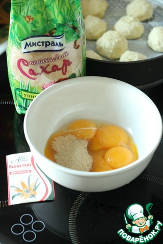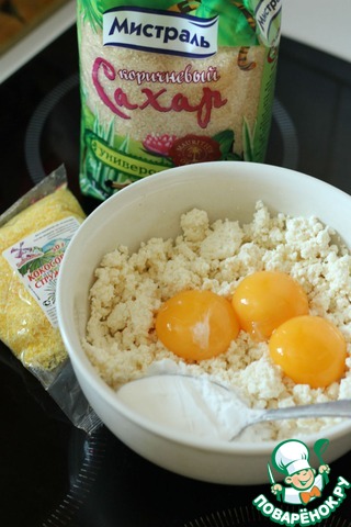 творог, 3 куриных желтка, кокосовая стружка и крахмал 3 ст. л., смешать в одной чаше