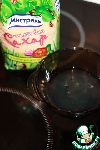 Теперь приготовим меренгу. Нам опять понадобится 200 г сахара коричневого ТМ "Мистраль". Сварим сироп из сахара и воды. Пусть покипит пару минут.