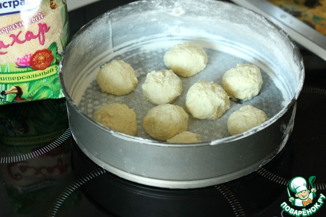 Мокрыми руками сформируйте шарики и выложите их в форму для выпечки торта. У меня разъемная, на всякий случай смазала ее сливочным маслом и присыпала мукой. Отложить пока в сторону.