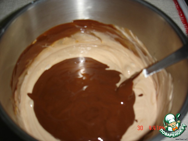 Сливки взбить в густую пену, добавить жидкий шоколад и перемешать.