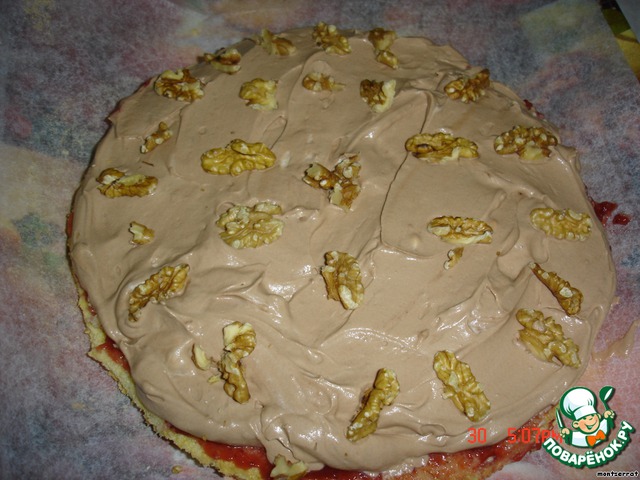 Бисквитный корж смазываем вареньем, оставляем на 20 мин, чтобы впиталось, потом выкладываем сливочно-шоколадный крем, сверху располагаем ядра орехов, накрываем вторым бисквитным коржом, слегка придавливаем. Верхний корж смазываем тонким слоем масляного крема, накрываем белковым коржом, опять смазываем масляным кремом.