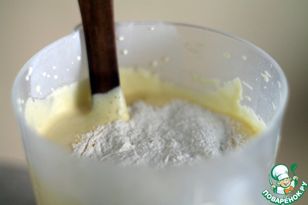 Муку смешать с разрыхлителем и аккуратно ввести в яичную массу.