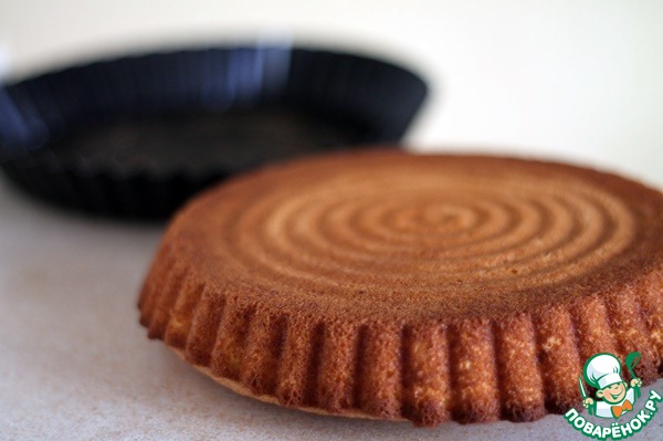 После запекания немного охладить бисквит, удобно это делать перевернув выпечку в форме вверх дном и оставить на решетке,