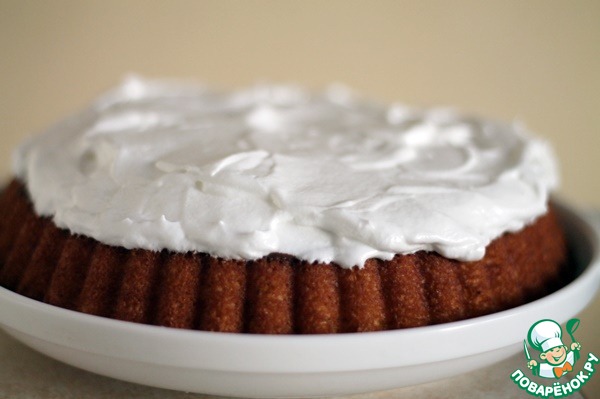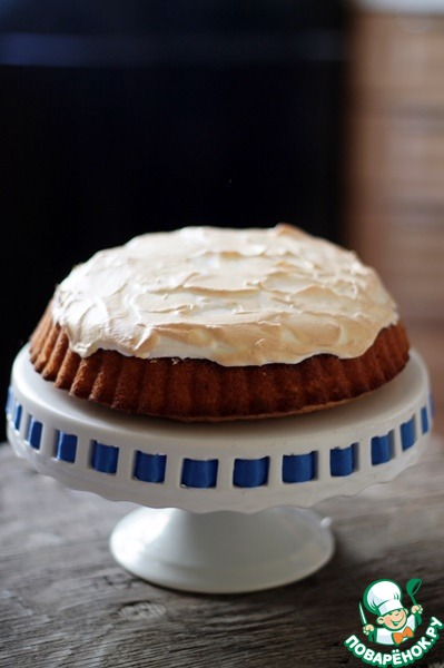 Белки с сахарной пудрой взбить до пиков, выложить поверх начинки.