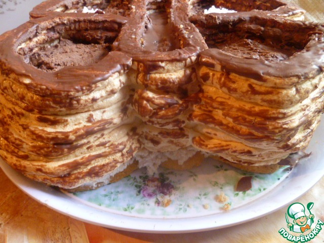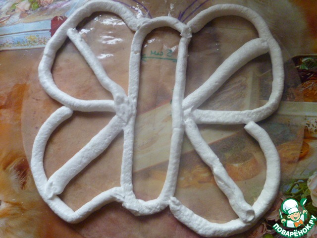 Для этого на пергамент кладем одну бабочку, сверху наносим слой безе, который остался, затем сверху крема ставим вторую заготовку, слегка прижимая, слой крема и сверху третья заготовка.
