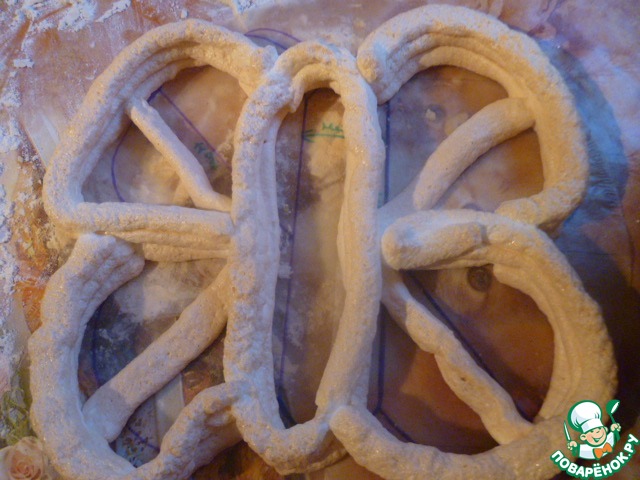 Затем тонко раскатать на пергаменте, приложить шаблон, вырезать бабочку, перенести с пергаментом, наколоть вилкой и выпекать в горячей духовке при 200 градусах 15 минут.