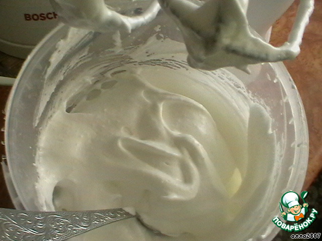 3 белка взбить в крутую пену, добавить 150 г сахара и снова взбить.
