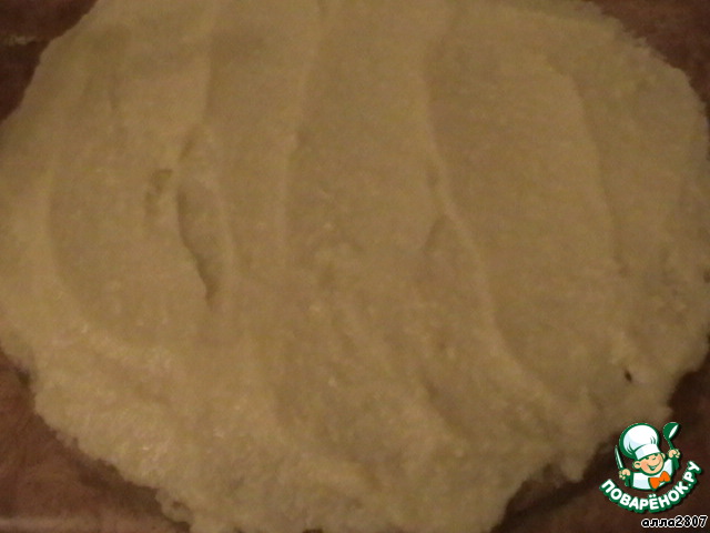 Смешать: 3 желтка, 1 яйцо, 100г сахара, ростопить 50г масла, разрыхлитель и 2/3 стак. муки. Получилась масса консистенции сметаны. Выпекать при температуре 180град.