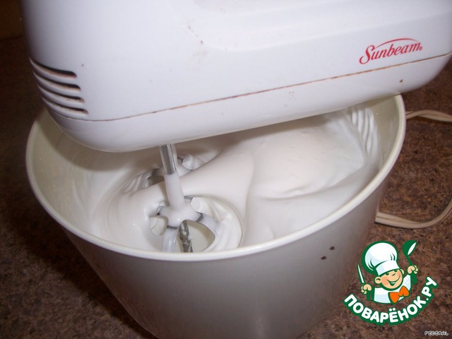 через 20 минут выпекания коржа начинаем взбивать белки с сахаром и щепоткой соли до устойчивой массы.