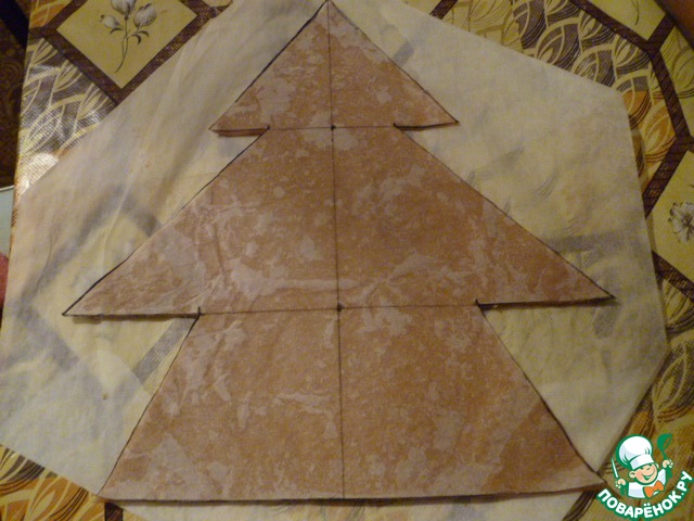 Скажу честно, я не планировала изначально делать пошаговые фото, так как не знала, что у меня получится. Сначала я нарисовала на пергаменте ёлочку, которая бы поместилась на моем противне. У моей ёлочки высота- 24,3 см, ширина верхней ветки- 12 см, средней- 24,3 см, основание- 20 см. Я вырезала один шаблон для медовых коржей и нарисовала 2 ёлочки на 2 листах пергамента для безе.