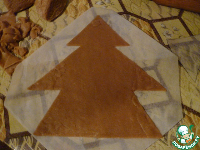 Затем делим тесто на 5 частей. Каждую часть кладем на пергамент, тонко раскатываем, прикладываем шаблон и ножом обрезаем лишнее.