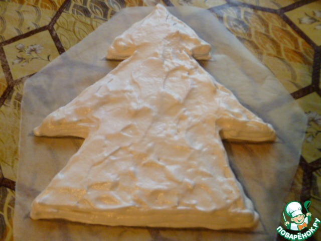 Сделать вторую партию безе и нарисовать по контуру в 2 слоя ёлочку и украсить по желанию. Печь в горячей духовке при 140 градусах 10 минут, дать остыть в духовке и снять бумагу.