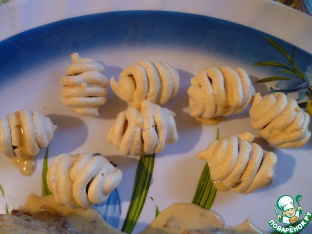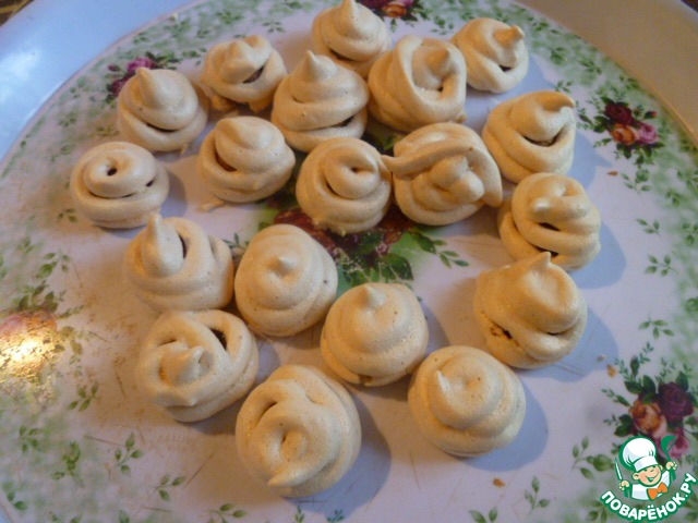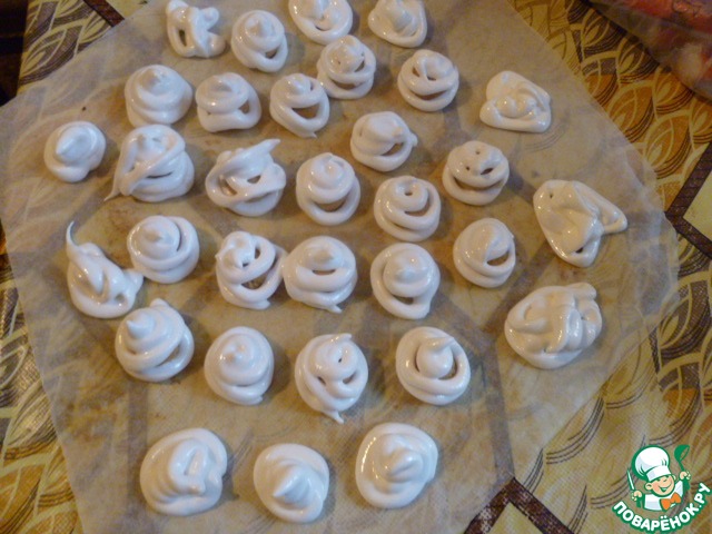 Из оставшегося белка сделать безе с печеньем внутри. Можно шарики из медового теста сначала испечь, а можно оставить сырыми. Сверху покрываем безе и выпечь в духовке при 160 градусах 20- 30 минут.