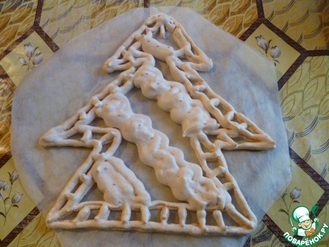 Затем выдавить из файлика все безе внутрь елочки так, чтобы все было ровно. Я делала 2 слоя. Выпекать в горячей духовке при 160 градусах 90 минут ( у меня духовка с конвекцией). Затем дать остыть в духовке и снять бумагу.