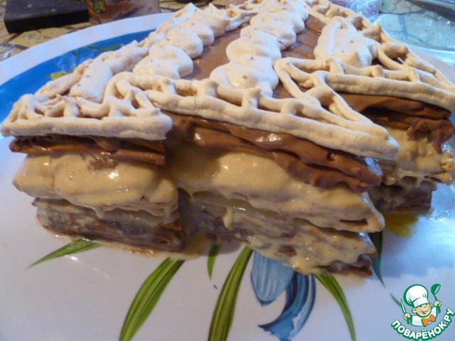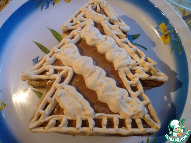 Затем снова 2 медовых коржа с заварным кремом. Сверху кладем корж- украшение из безе.