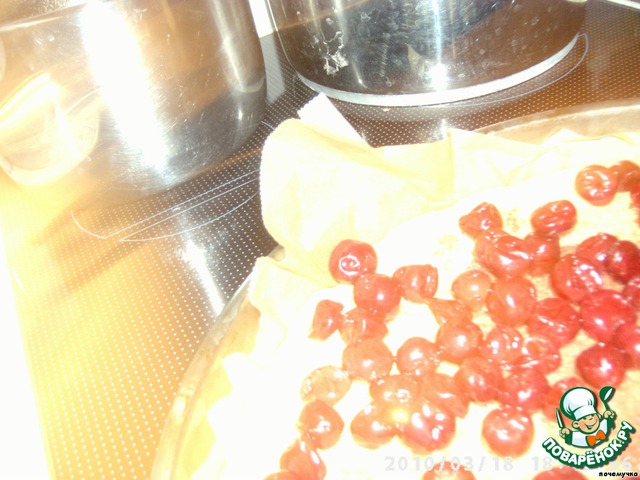 Клюкву, облепиху, вишню или смородину засыпаем сахаром и выкладываем на готовый корж.