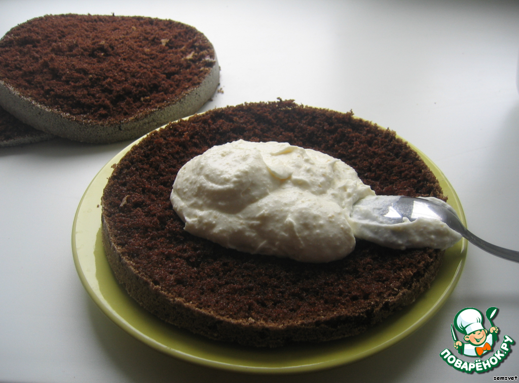 Собрать торт. Каждый слой густо покрывать кремом. Крем очень хорошо держится, можно делать толстый слой. Оставить немножко крема для обмазывания торта снаружи.