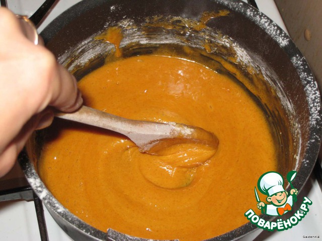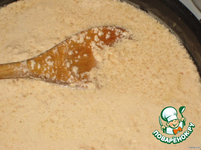 Как только вся масса превратится в пену, это займет около 30-40 секунд, снять с огня, подождать минуту и всыпать 2/3 стакана муки, быстренько перемешать лопаточкой, чтобы не было комков. Получится такая приятная карамельная масса.