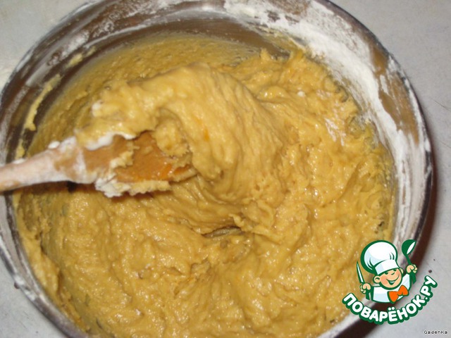 Вылить медовую смесь в творожную, перемешать, затем всыпать остальную муку и перемешать.