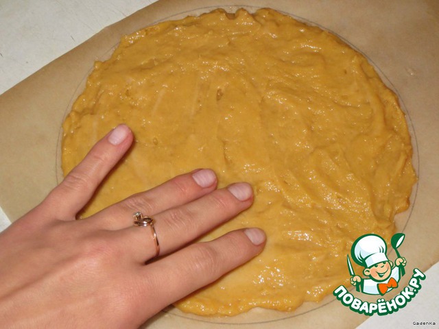 Пока нагревалась духовка я сразу распределила все тесто, получилось ровно 4 коржа, не больше, не меньше, диаметр кругов 20 см.