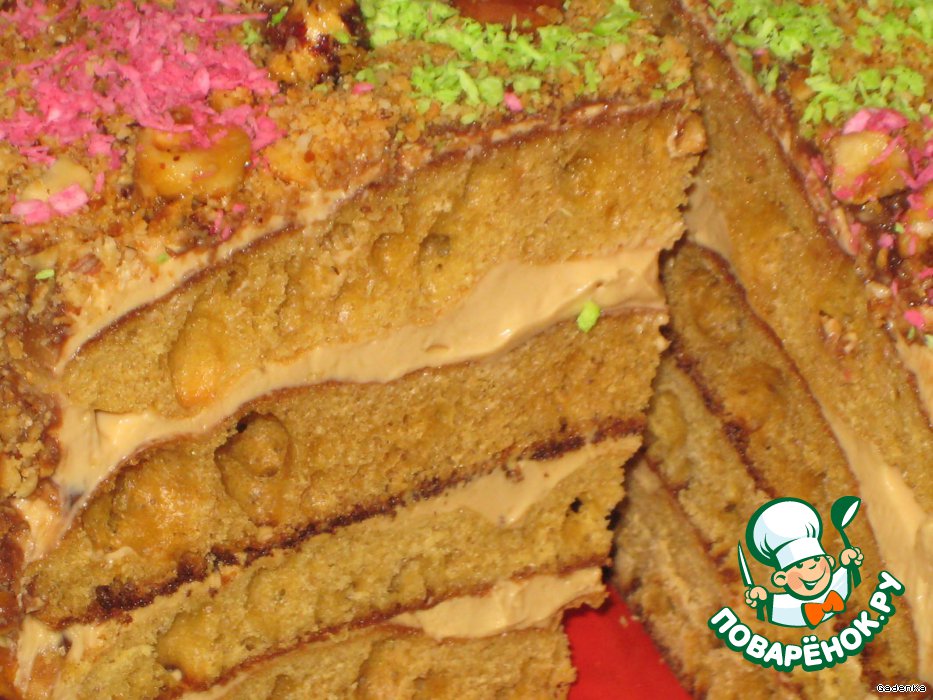 Верх и бока обмазываем кремом и посыпаем толчеными орехами или крошками от печенья (от коржей).