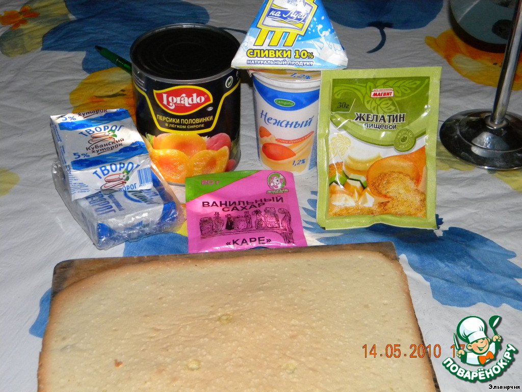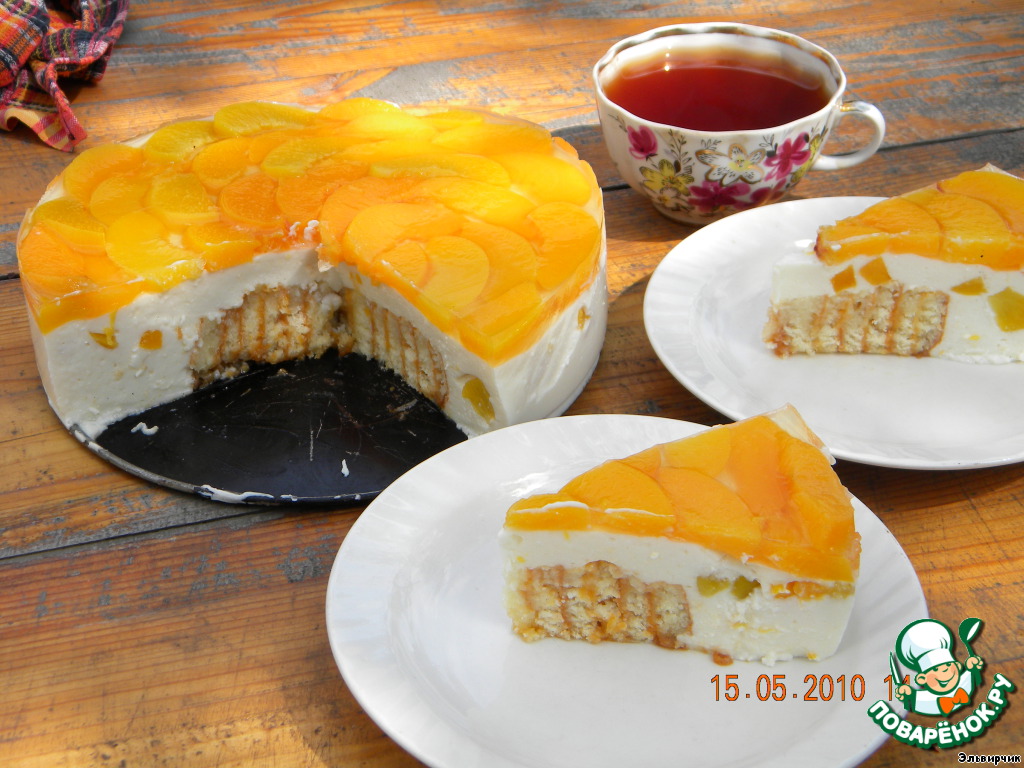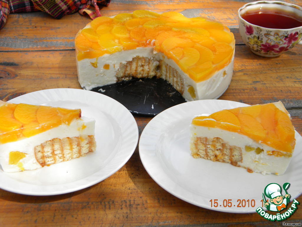 Добавляем распущенный желатин, ещё раз перемешиваем и заливаем в форму. Можно добавить немного порезанных персиков. Убираем в холодильник на 40-50мин.