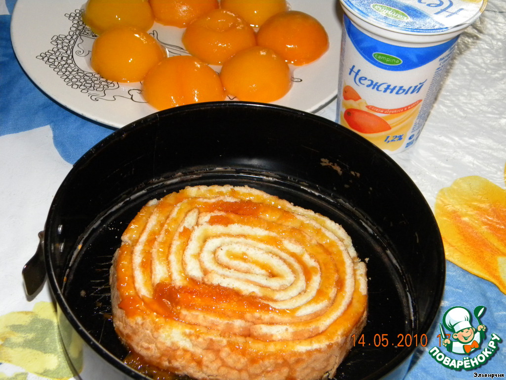 Разрежем наш бисквит на 6 одинаковых полосок.Теперь смазать каждую вареньем, дать пропитаться...и когда они станут мягкими сворачиваем каждую в по спирали, в нашей съёмной форме.Круг должен получится меньше, чем диаметр формы (моя форма-22см).Сверху пропитать слегка сиропом от персиков.