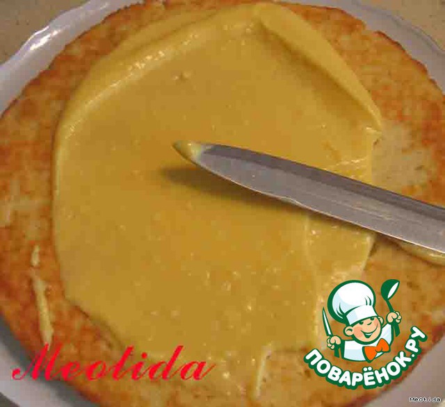 на большое блюдо кладем кокосовую пышку, намазываем хорошенько кремом
