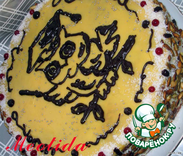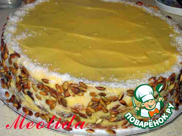 бока тортика посыпаем жареными тыквенными семечками и кокосовой стружкой (можно взять любые орешки, шоколад или кокосовую стружку)