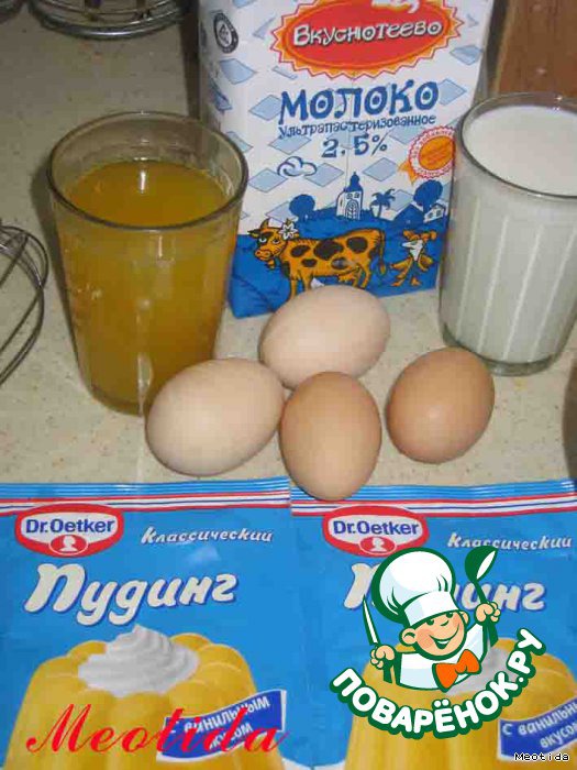 для крема нам понадобится оставшийся после пропитки коржей сок (у меня остался где-то стакан), молоко(3стакана), яйца (4шт, у меня домашние мелкие, крупных можно взять два), сахар (1 стакан), сливочное масло (50 грамм), сухая смесь для пуддинга (2 пакета, благодаря этой добавке, крем получается нежнее и мягче)