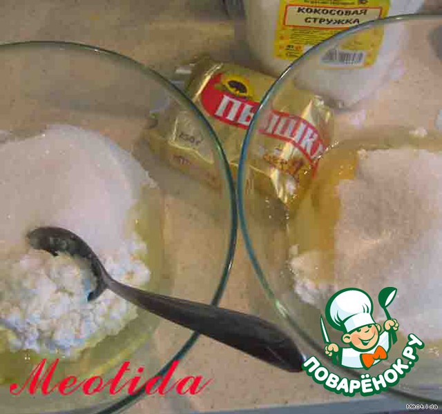 берем две большие миски, в каждую миску кладем по 2 яйца, 200грамм творога, 1/2стакана сахара, немного ванилина и все хорошо перемешиваем