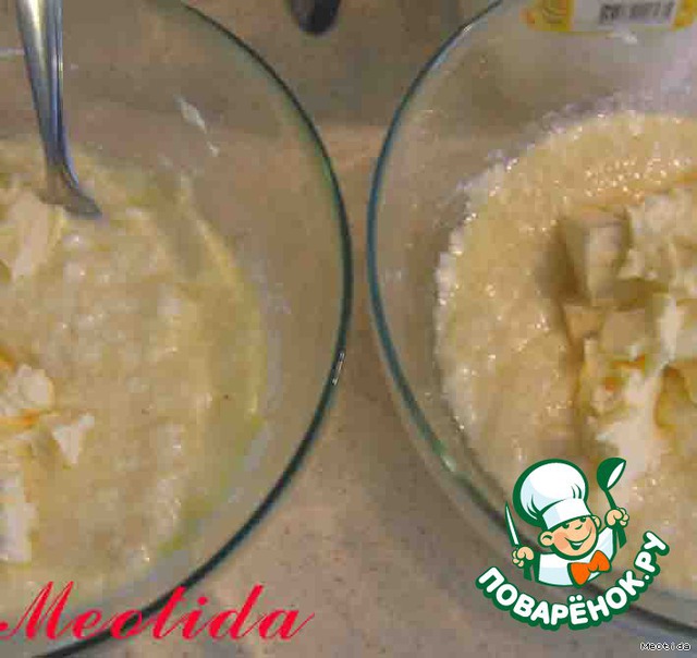 теперь добавляем в каждую миску по 100 грамм размягченного (комнатной температуры) маргарина, по 1/2стакана молока и хорошенько все перемешиваем вилочкой