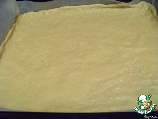 Противень выстилаем бумагой для выпечки, распределяем тесто, делаем бортик.