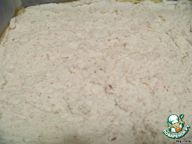 Сверху распределяем творожную массу. В оригинале рецепта поверх творожной массы нужно еще рассыпать 50 г изюма, я делала без него.