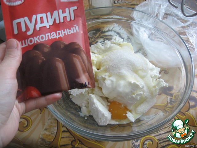 Для начинки смешать творог, желтки яиц, сгущенку, сметану, разрыхлитель и пудинг.
