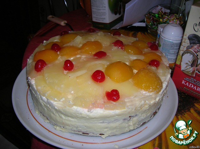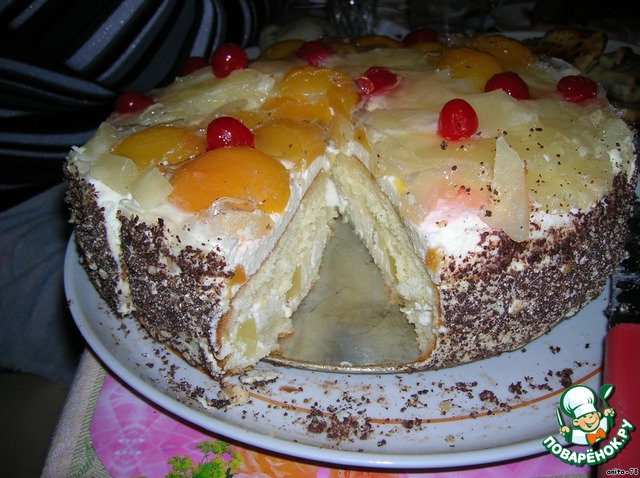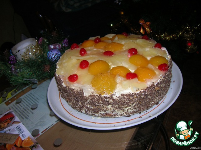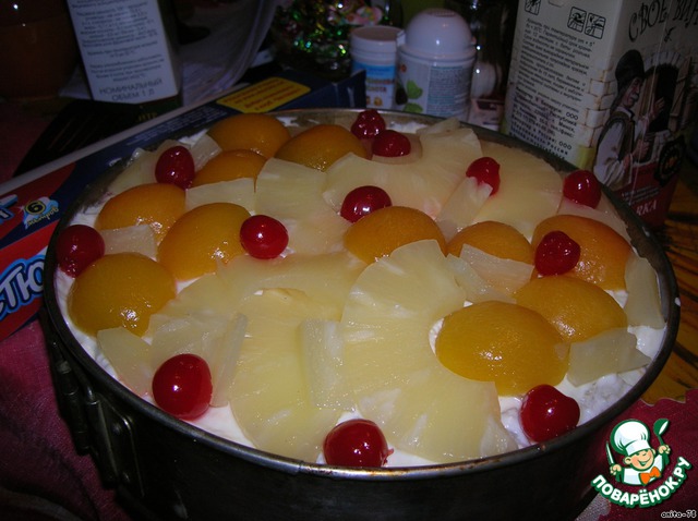 Достаем из холодильника и выкладываем фрукты. Готовим желе для торта согласно инструкции на пакете. Заливаем верх торта. И в холодильник - на 1 час!