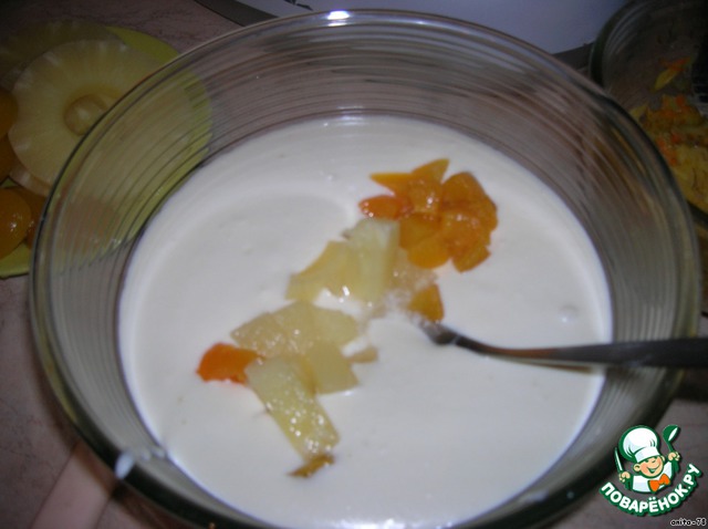 Желатин 2,5 ст.л. заливаем сиропом 150г(из банки), ананасы и абрикосы - часть откладываем для украшения, часть - в суфле.