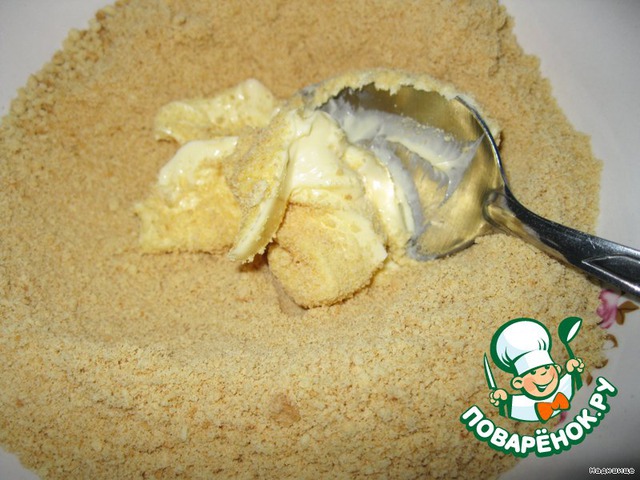 Добавляем 70 г сливочного масла и тщательно перемешиваем с крошкой