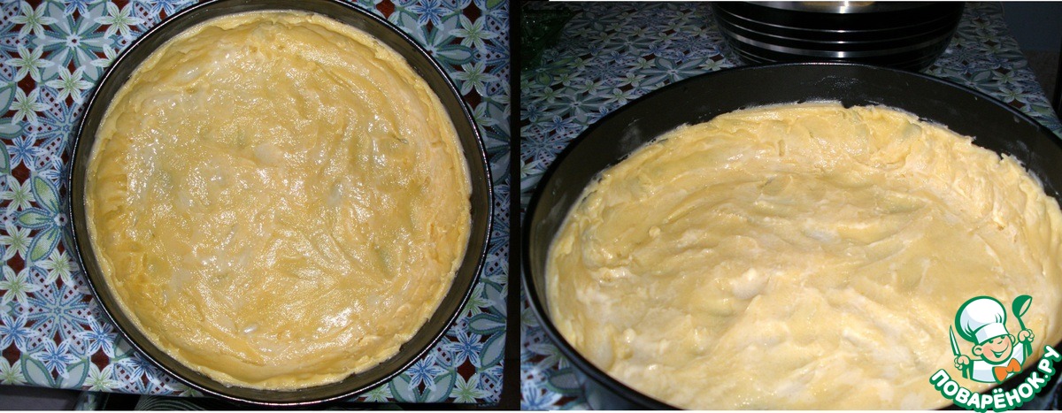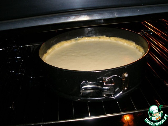 В съёмную форму выкладываем тесто (Я периодически смачиваю руки в воде и распределяю пальцами по дну, поднимая по бокам на 2-3 сантиметра).